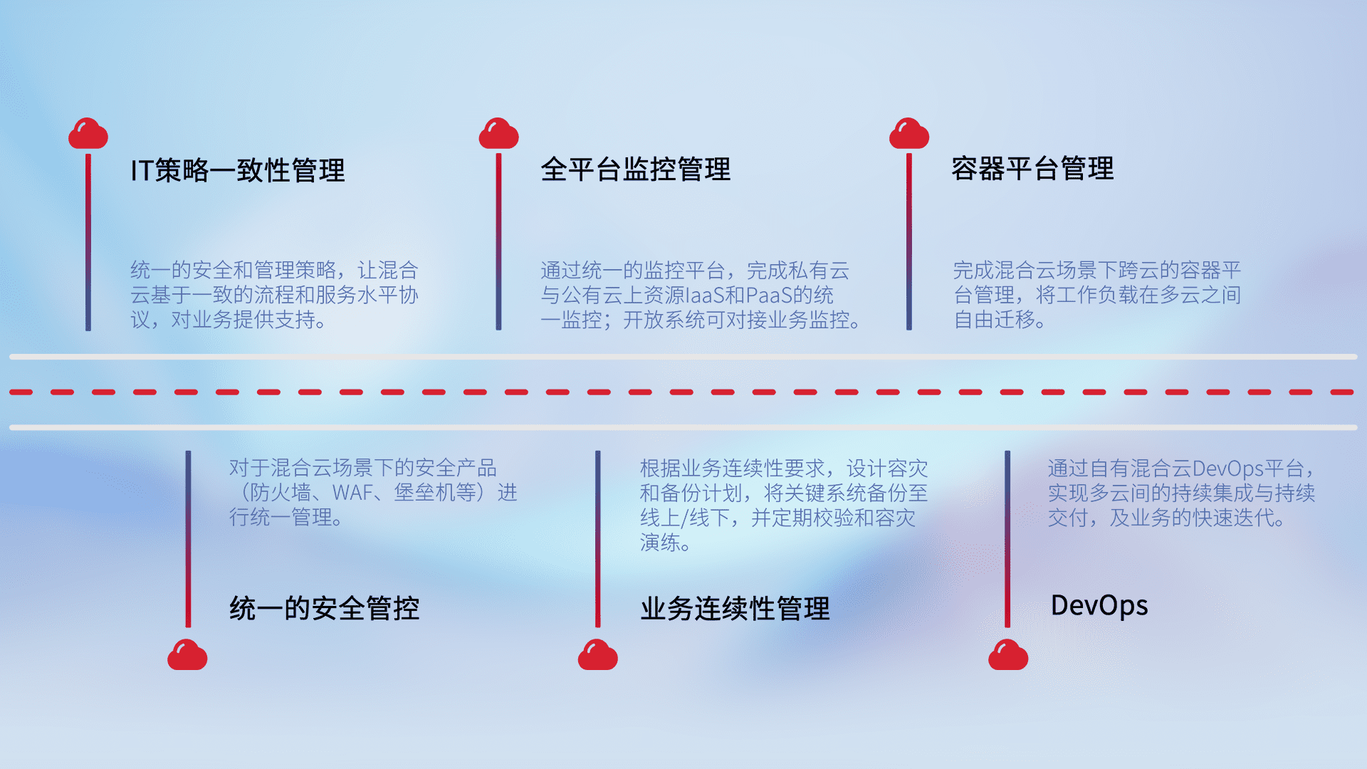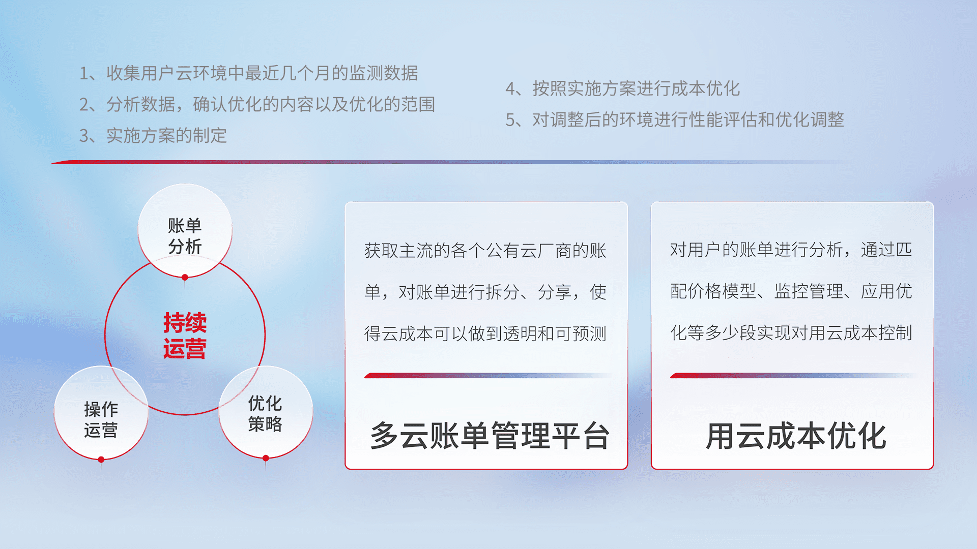 通过多云纳管,,,,以统一的资源数据模型把客户的云资源进行抽象和封装,,,进而实现对多云资源的统一操作,,保障云资源管理的可靠性、、、稳定性与可用性。。。。量身定制化运维内容,,,配置、、、开发运维、、、、补丁管理、、、、备份、、、、监控、、、认证和访问管理、、、审计和日常巡检等,,,保障在用云过程中的可靠度,,稳定度以及高可用率。。。。